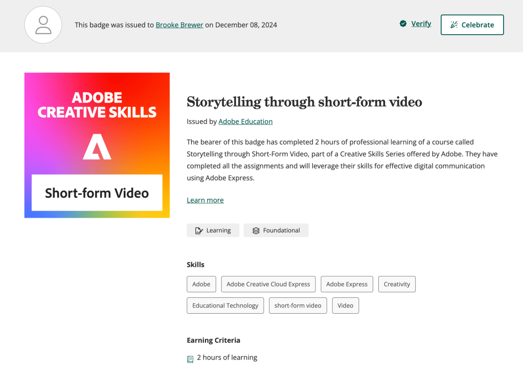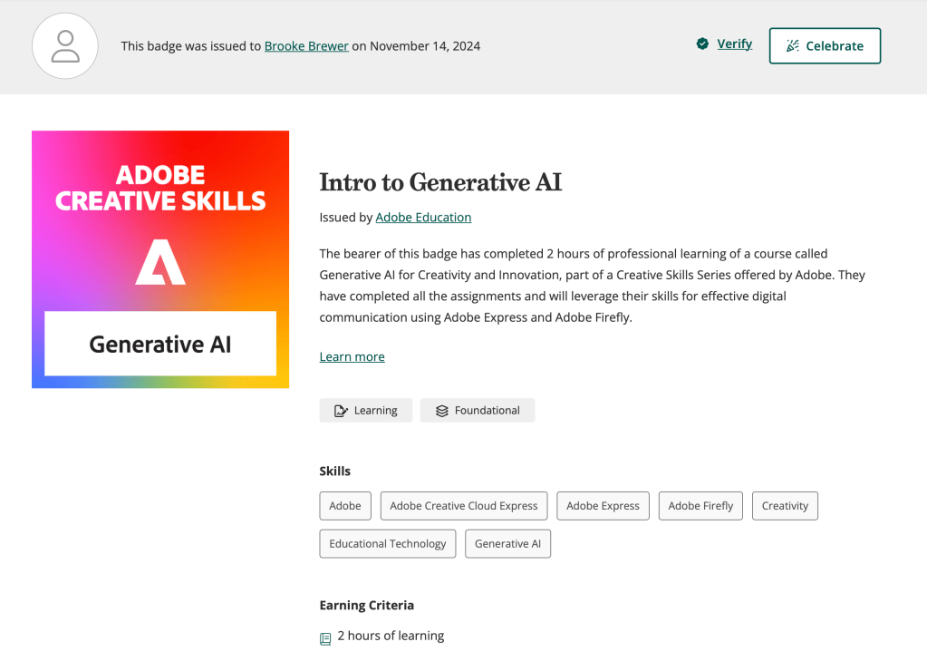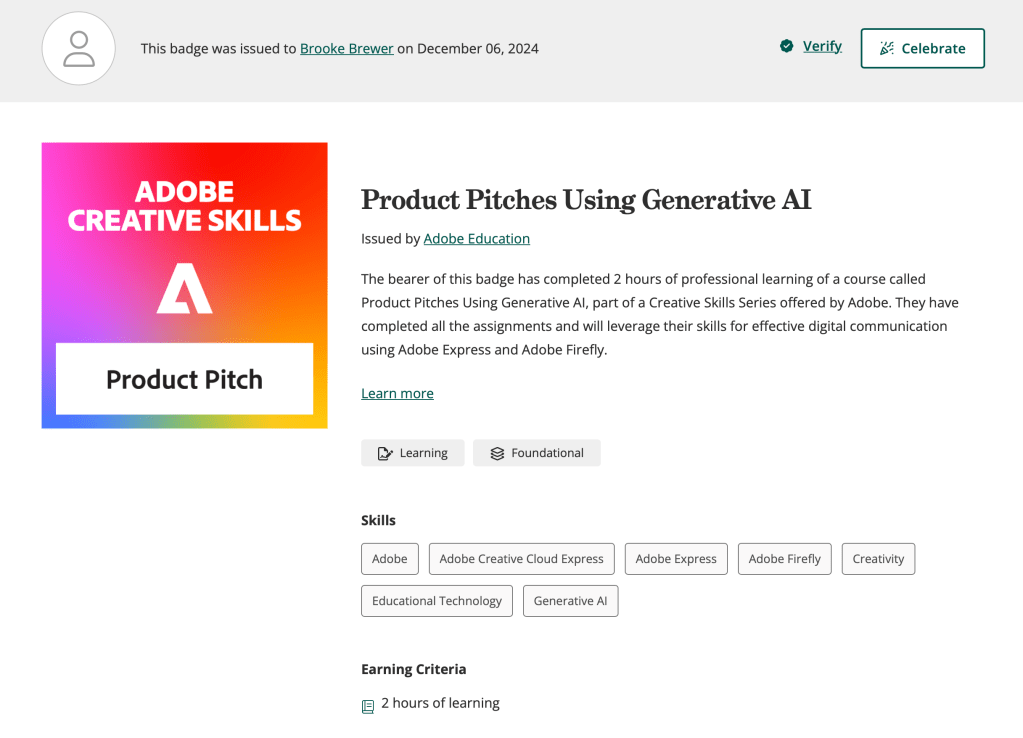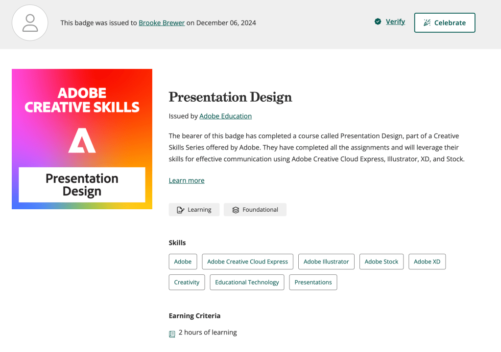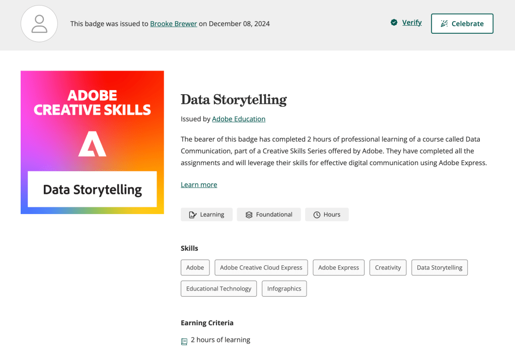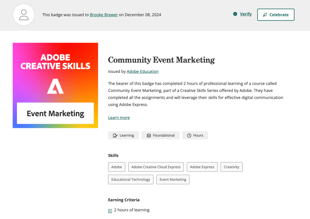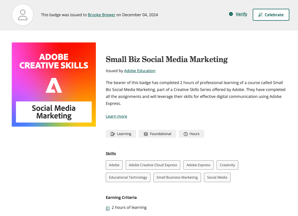 Learned about Google reports, shortcuts, dashboards, and important metrics.Through Codeacademy, I learned CSS and HTML languages as well as website design principles.I completed assignments and will leverage my skills for effective digital communication using Adobe Express, Rush, Lightroom, Photoshop, and Stock.I completed assignments that will leverage my skills for effective digital communication using Adobe Express and Adobe Firefly.I completed assignments that will leverage my skills for effective digital communication using Adobe Express, Rush, Lightroom, Photoshop, and Stock.I completed assignments that will leverage my skills for effective communication using Adobe Creative Cloud Express, Illustrator, XD, and Stock.I completed assignments that will leverage my skills for effective communication using Adobe Express, Acrobat, Lightroom, InDesign, and Stock.I completed assignments that will leverage my skills for effective digital communication using Adobe Express and Adobe Firefly.I completed assignments that will leverage my skills for effective digital communication using Adobe Express.I completed assignments that will leverage my skills for effective digital communication using Adobe Express.I completed assignments that will leverage my skills for effective digital communication using Adobe Express.I completed assignments that will leverage my skills for effective digital communication using Adobe Express.