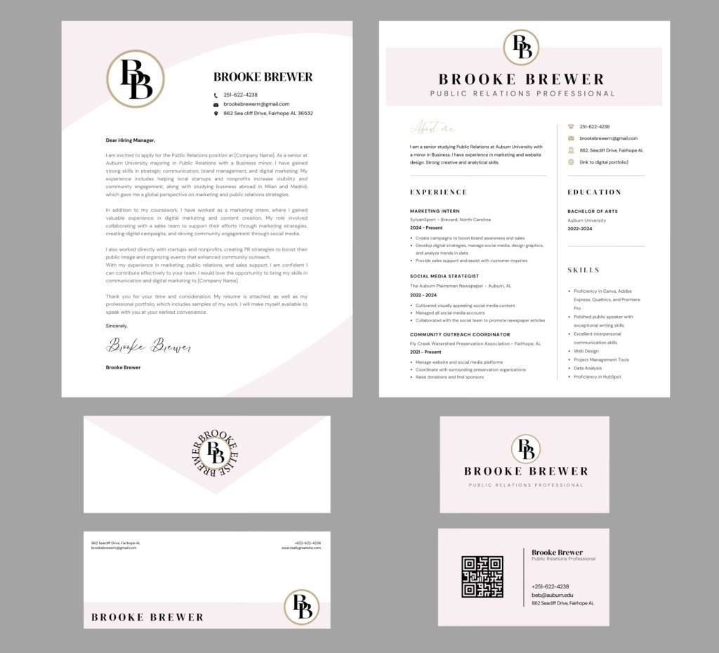 For this project, I used Adobe Photoshop to design a comprehensive personal branding suite. The kit included a custom logo suite, watermarks, color palette with swatches and hex codes, and a typographical suite. I also created a resume, cover letter, envelope, and business card, all maintaining consistent branding. Through this assignment, I gained valuable skills in creating cohesive branding elements and a professional identity that aligns with personal and professional goals.